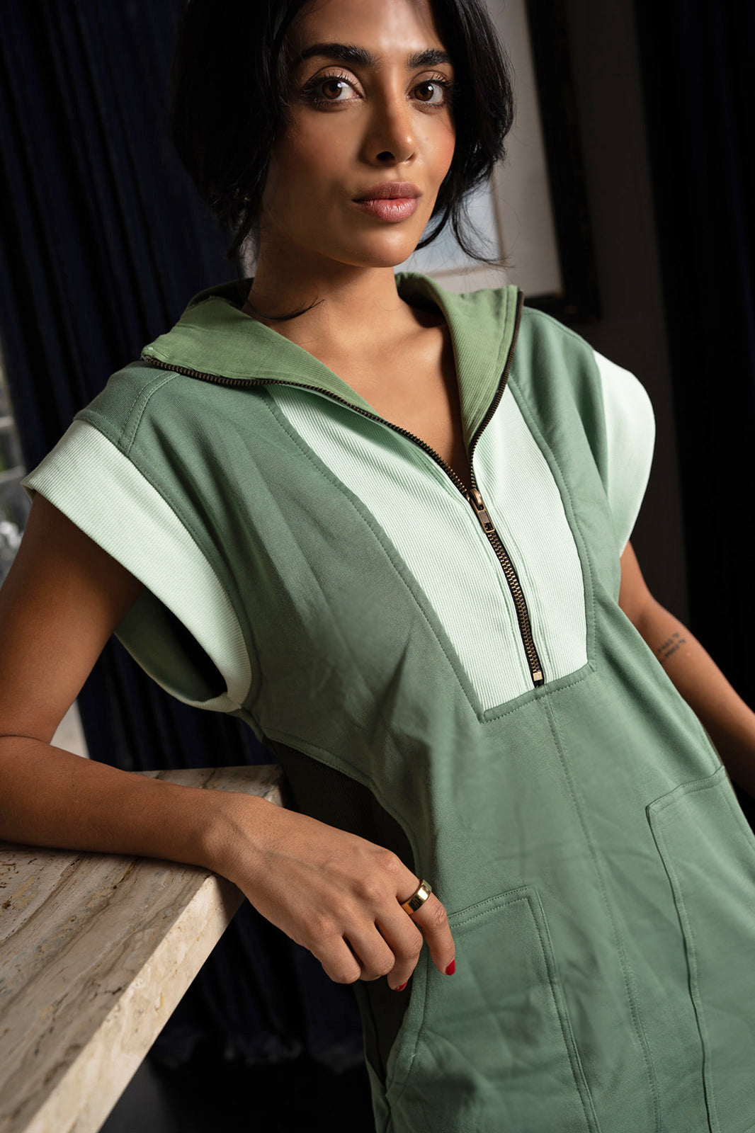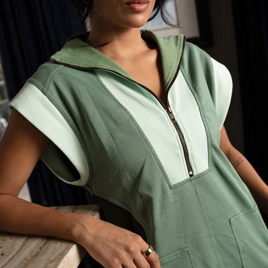 Featuring a half-zip neckline, roomy front pockets, a contrast panel design in our signature cypress green colorway, and a relaxed boxy fit that makes it an easy staple for busy days, layered looks, or casual nights out.