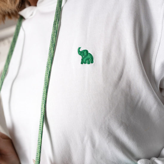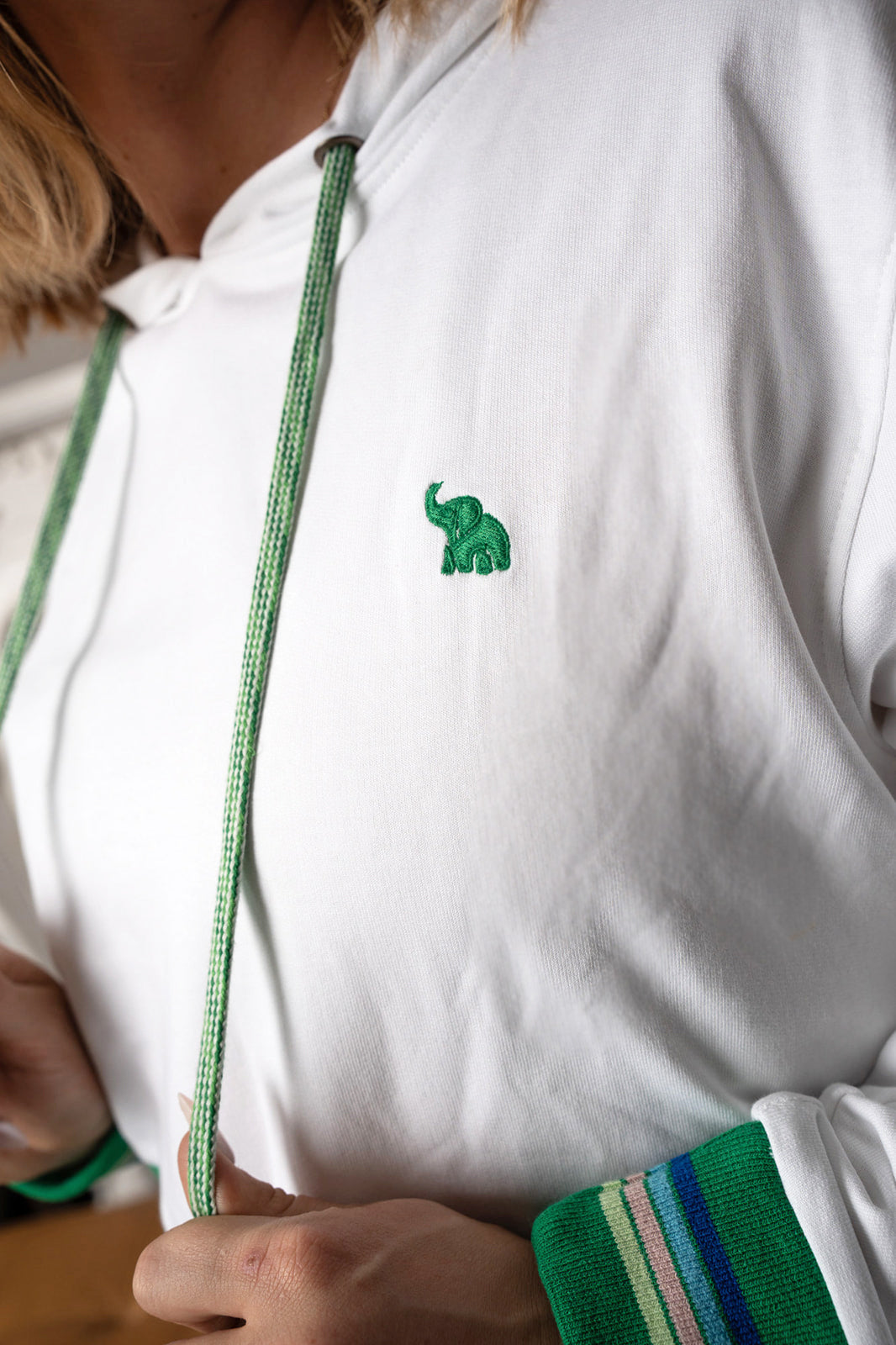 Inspired by retro athletic gear, this classic hoodie sports a crisp white base with contrast banding in a variety of our signature colorways: blues, greens, and sandy dune. Featuring a striped drawstring hood and a boxy cropped fit.