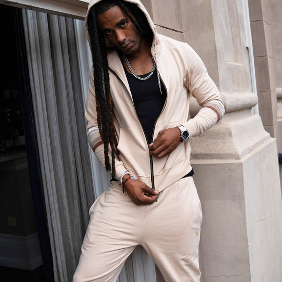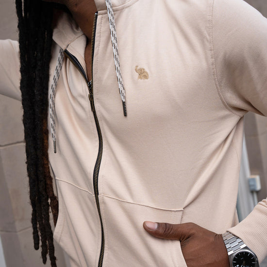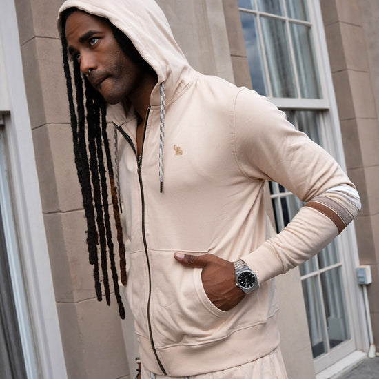 Find your rhythm in the Vintage Arm Stripe Zip Up Hoodie in Dune, a unisex essential designed for effortless comfort. Crafted from soft cotton french terrycloth with vintage-inspired arm stripes in our signature sandy dune shade keeps it neutral and versatile for year-round wear.