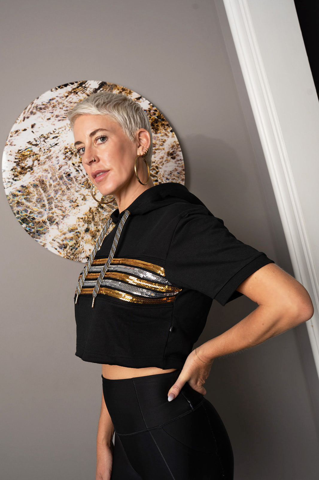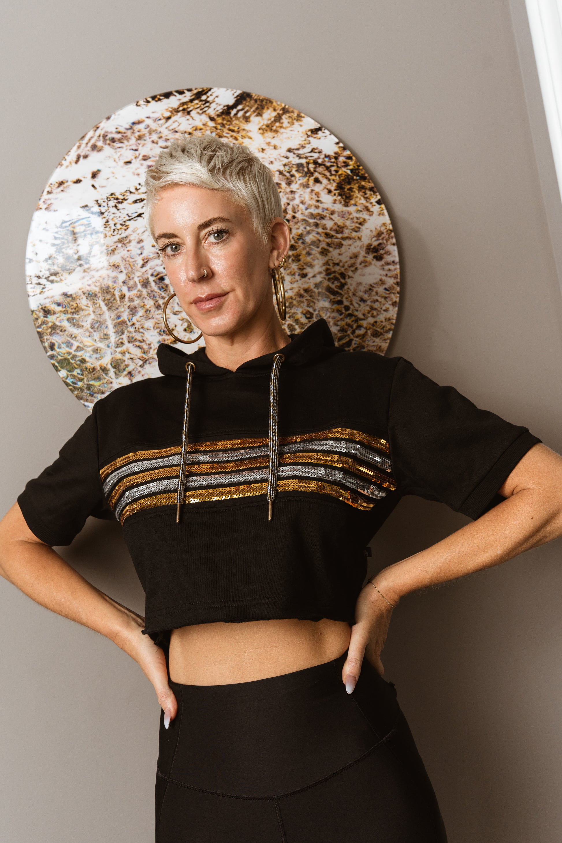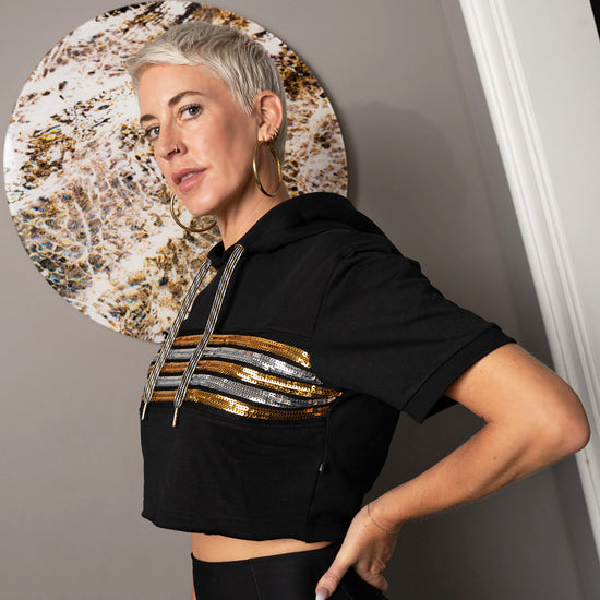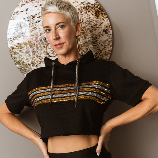 Inspired by retro athletic gear and team colors, this black and gold classic gets elevated with gold and silver sequin stripes across the chest. Featuring a drawstring hood, relaxed boxy cropped fit, and short sleeves for staying comfortable and cool.