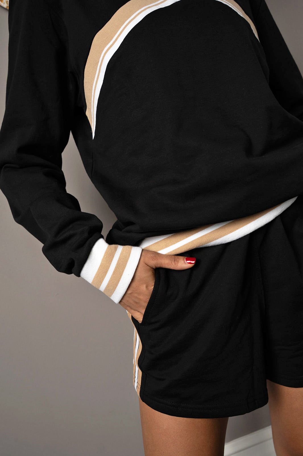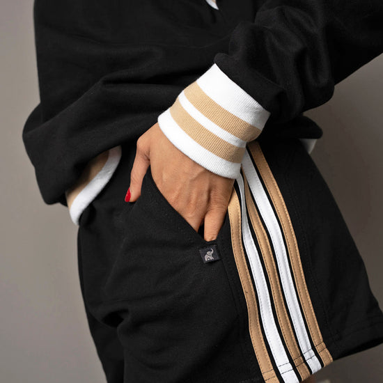 This vintage-inspired design nods to old school athletic shorts and team colors, sporting black and gold with stripes down the sides and waist. Featuring a drawstring adjustable waistband, side pockets, and a relaxed highwaisted fit.