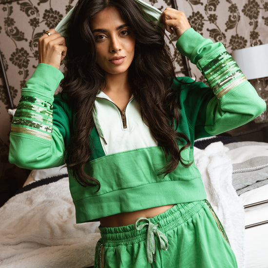 Make it a matching set and pair with the Palm Sequin Arm Stripe Half Zip Color Block Crop Hoodie.