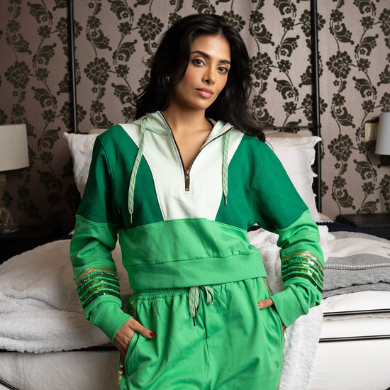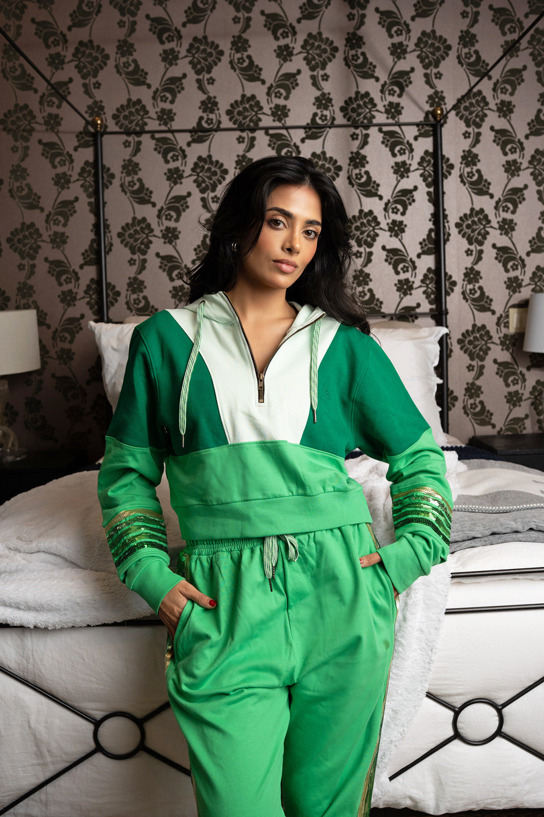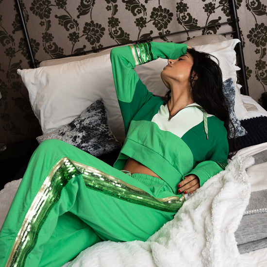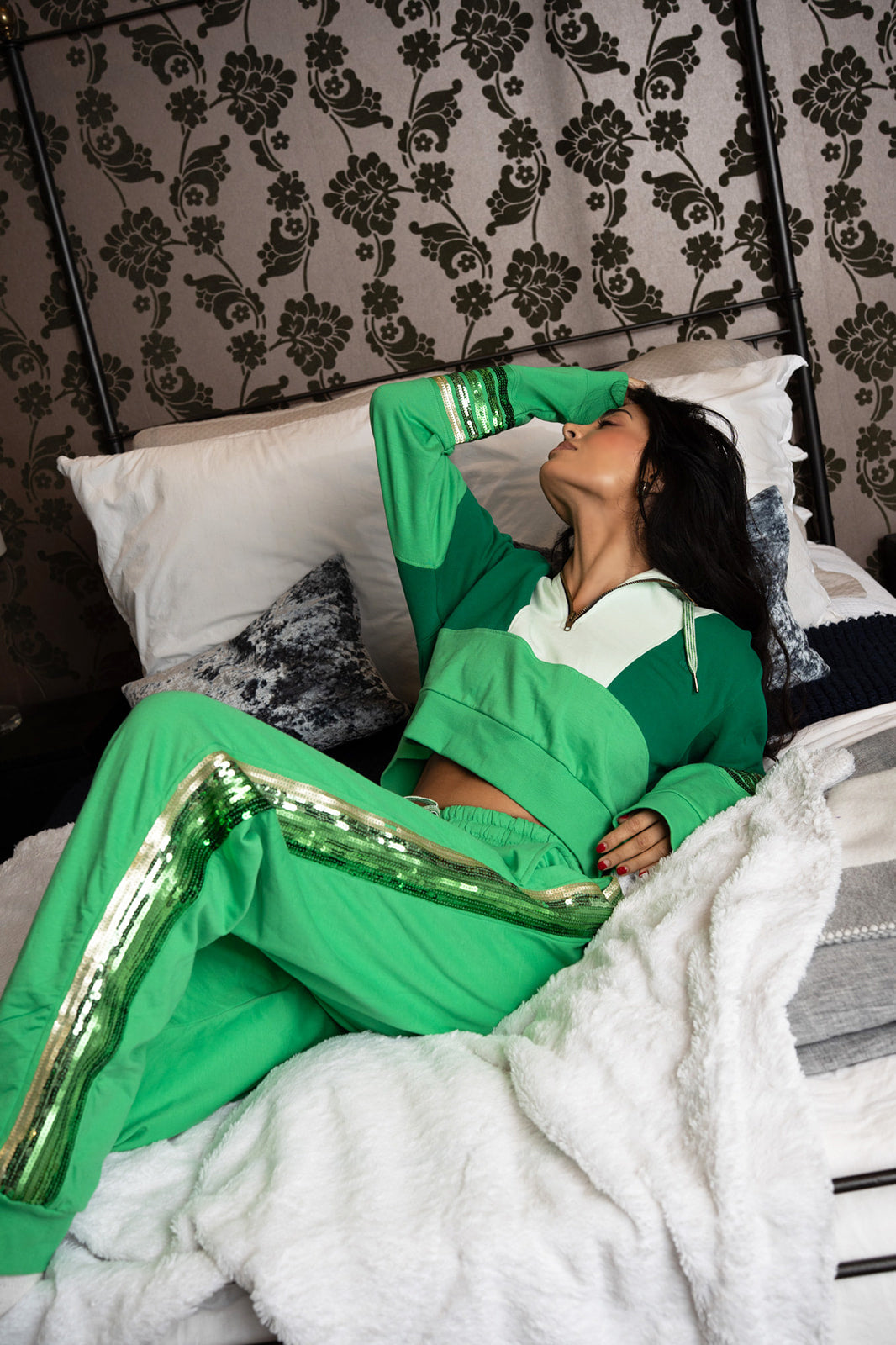 Our signature kelly green colorway gets elevated in tonal sequined side stripes for a retro-inspired silhouette. Designed with an elastic waistband, adjustable drawstring, tapered cuffs, and functional side pockets for everything from lounging at home to stepping out in effortless athleisure.