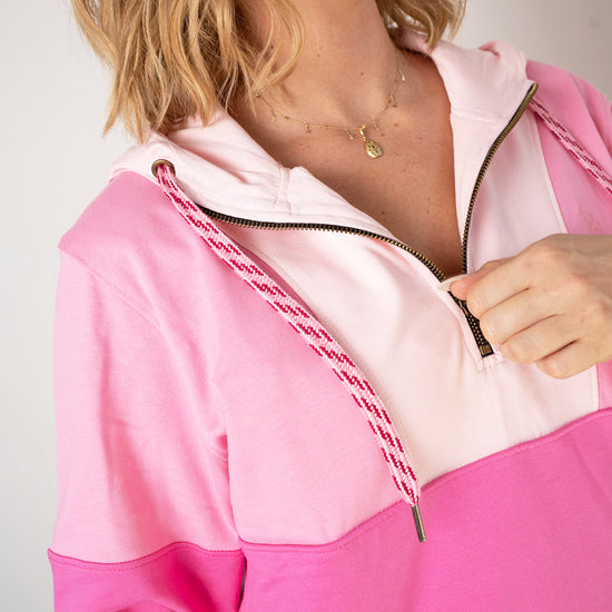 Our signature bold pitaya colorway gets elevated with color blocked pink hues and tonal sparkling sequin arm stripes. Features a half-zip neckline, kangaroo pocket, and a drawstring hood.