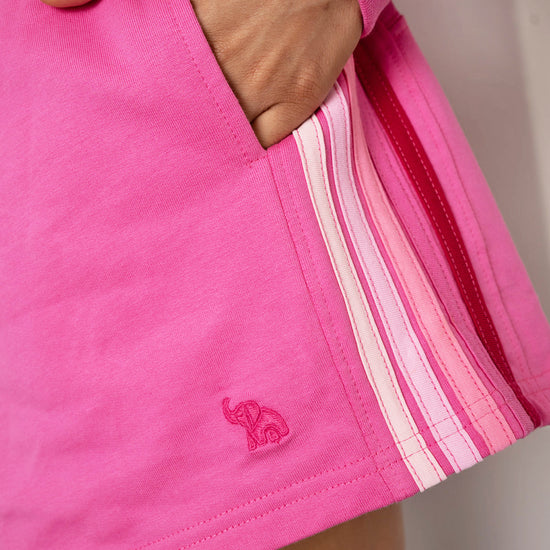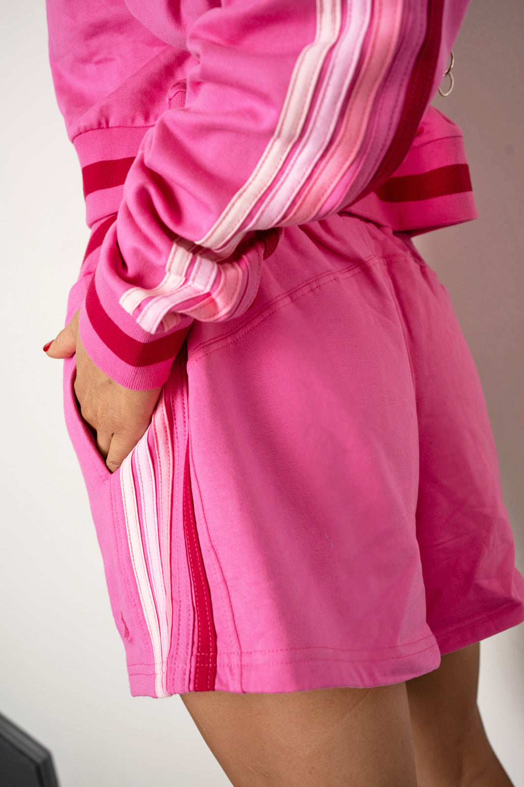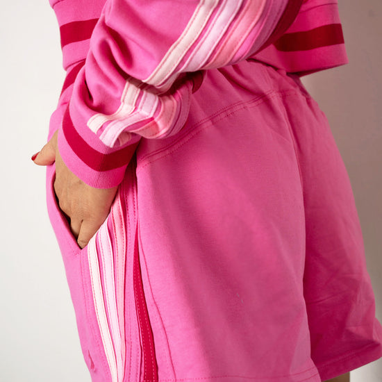 This vintage-inspired design in our signature bold pink colorway nods to old school athletic shorts with side stripes in tonal pink hues. Featuring a drawstring adjustable waistband, side pockets, and a relaxed highwaisted fit for a look that's the perfect mix of retro and modern.