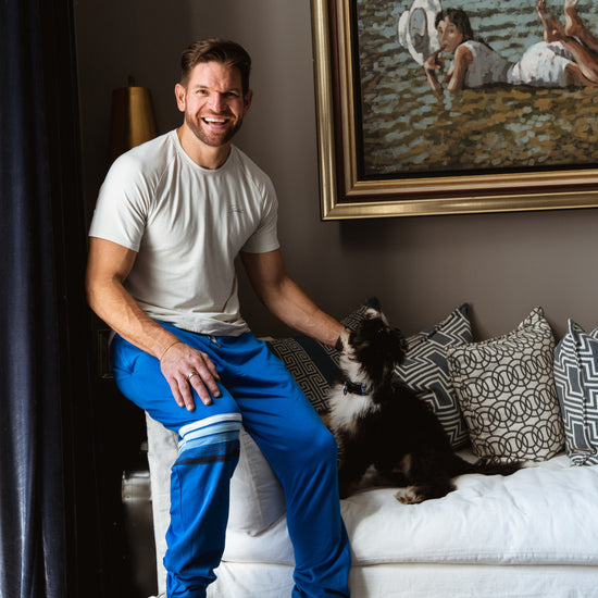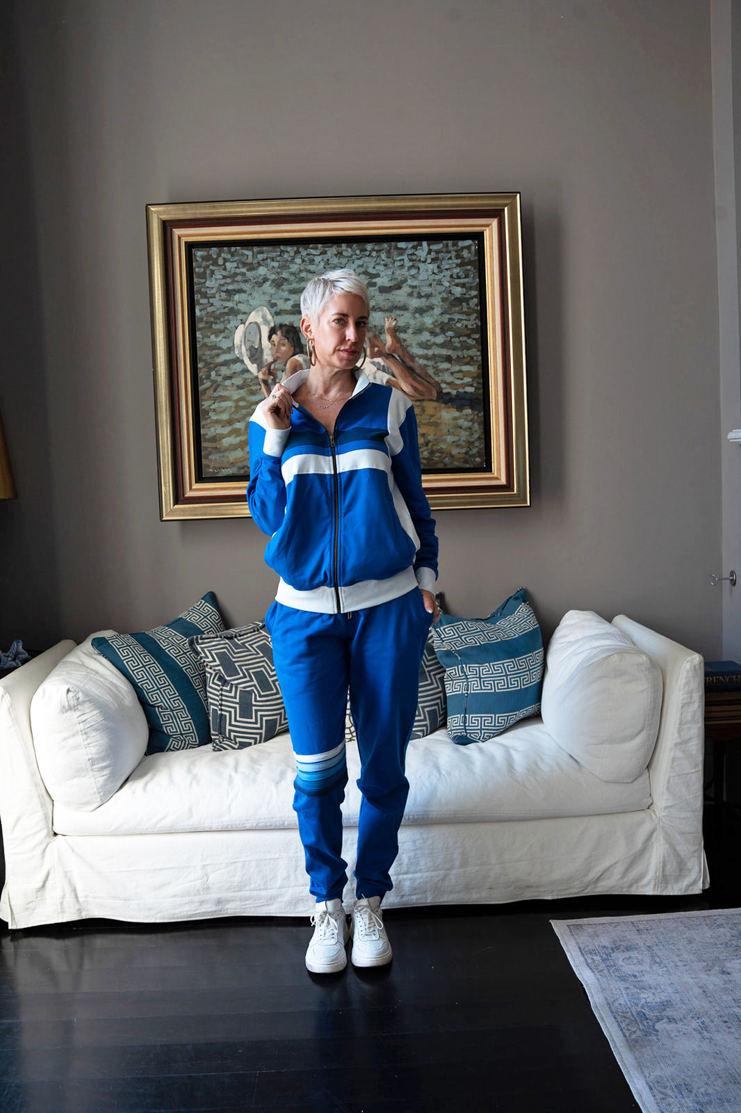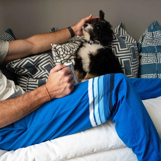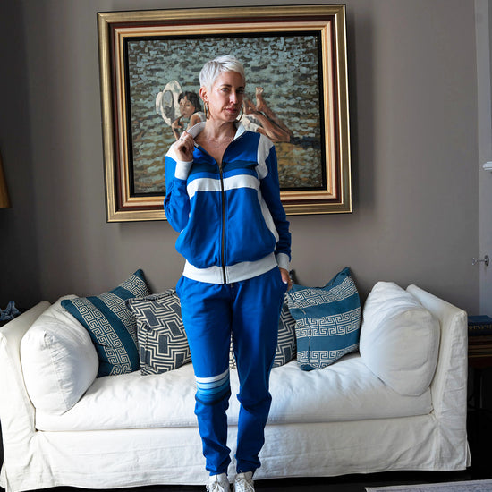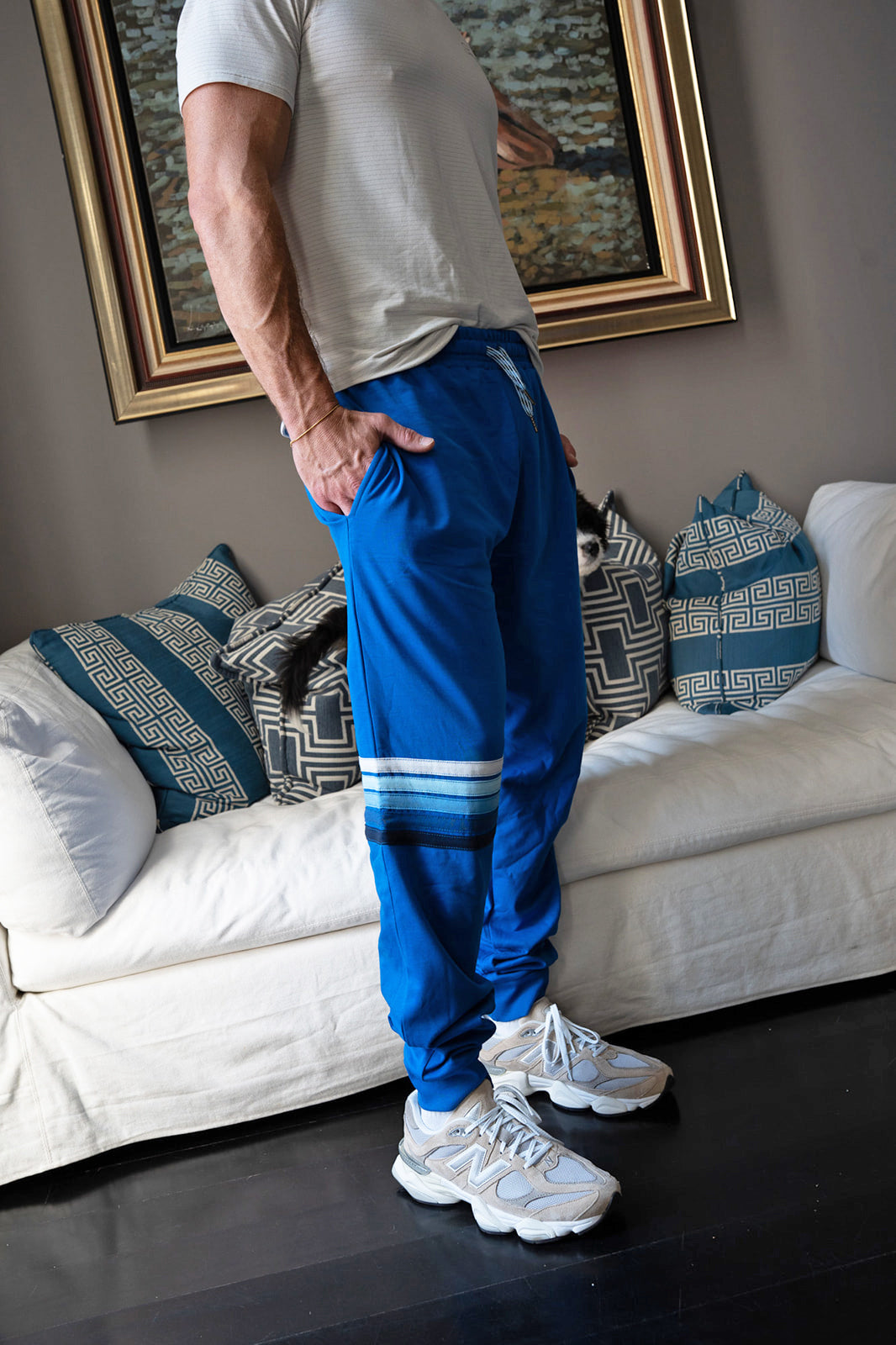 The hand stitched leg stripes in tonal navy blue shades give a retro nautical vibe to a modern athleisure staple, keeping it neutral and versatile for year-round wear.