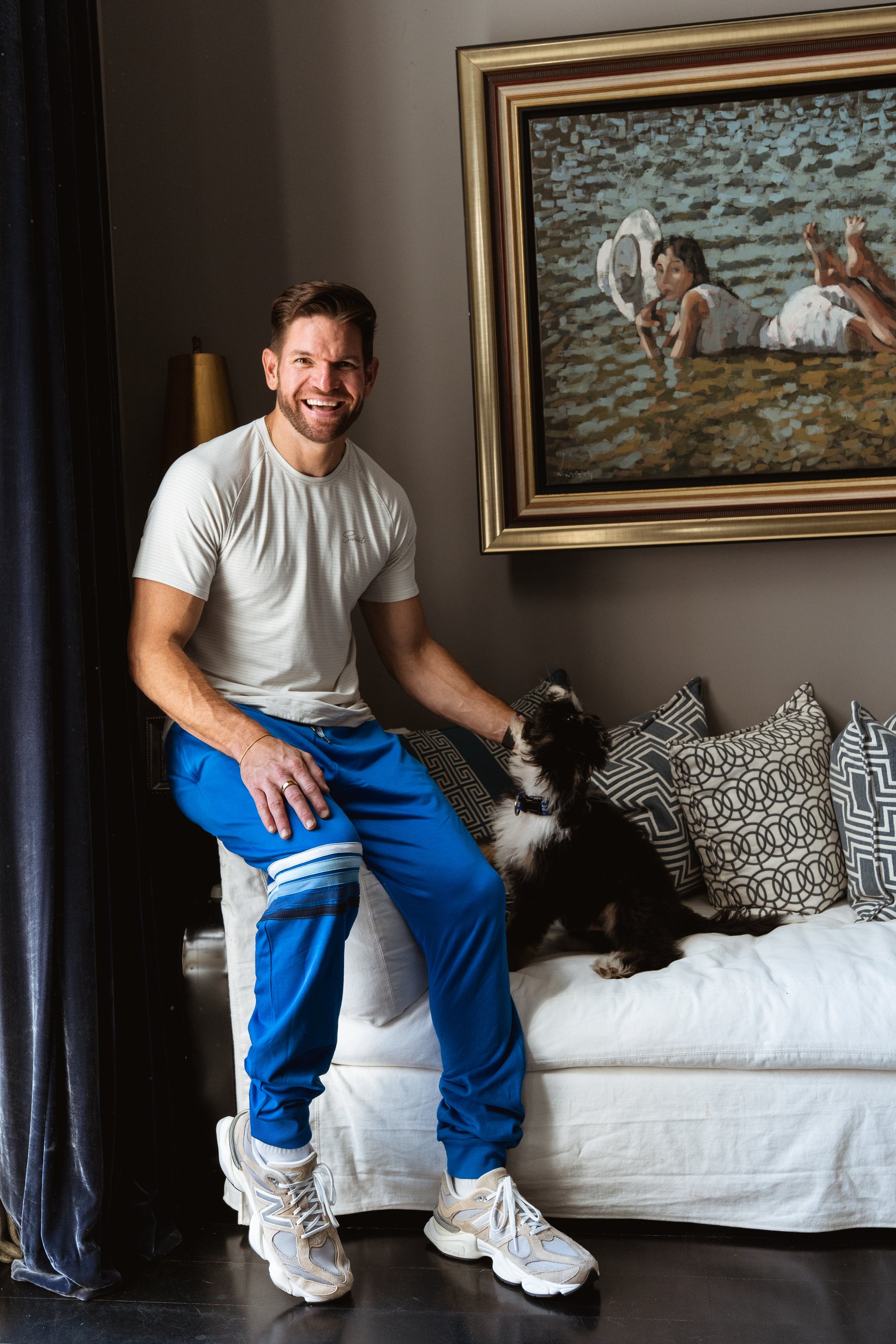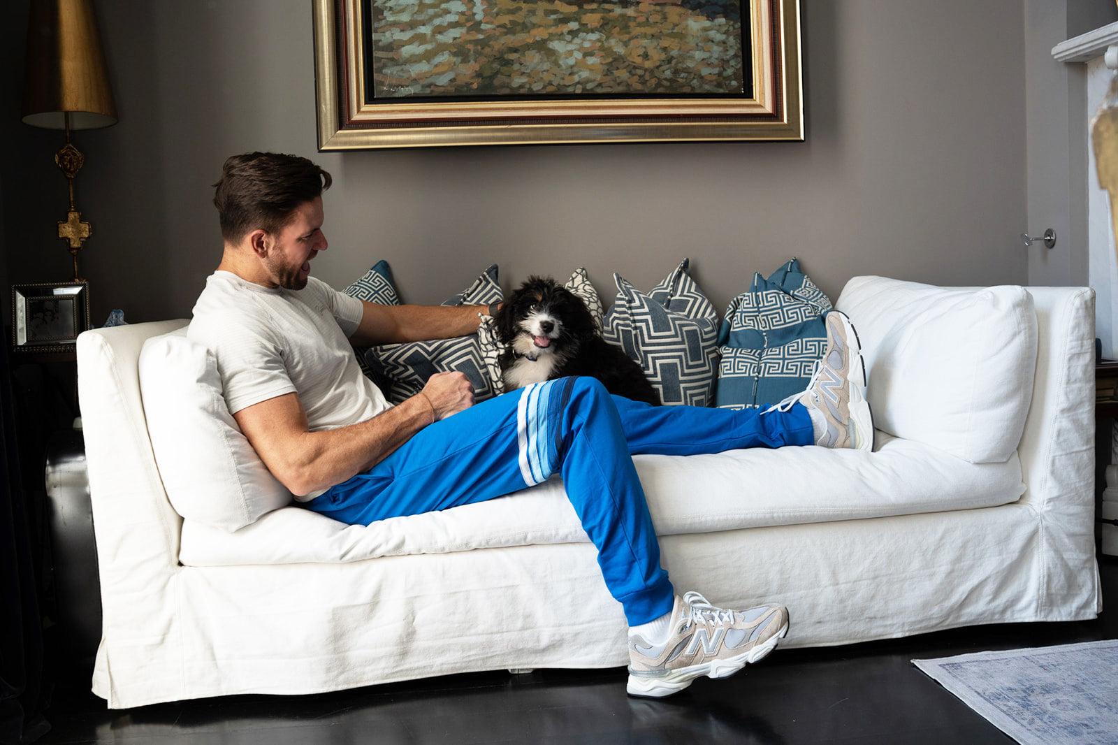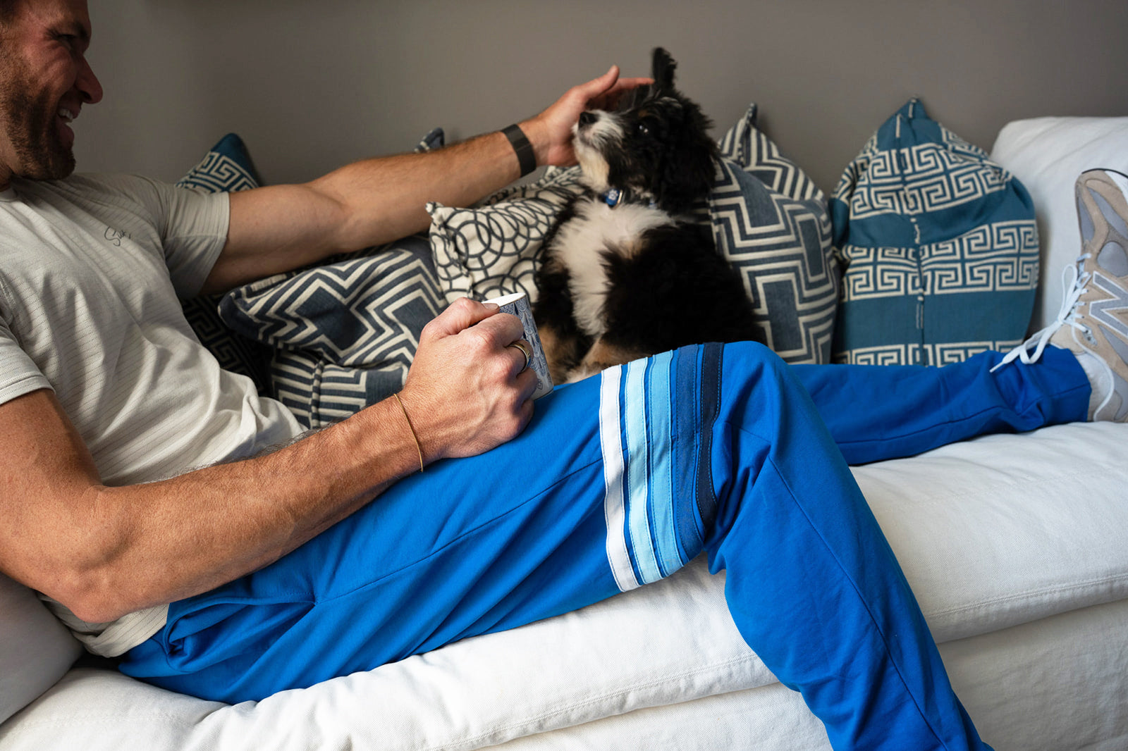 The hand stitched leg stripes in tonal navy blue shades give a retro nautical vibe to a modern athleisure staple, keeping it neutral and versatile for year-round wear.