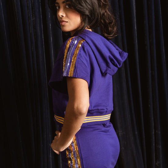 Show your stripes for game day and style with the Sher Sequin Shoulder Stripe Short Sleeve Crop Hoodie for the full elevated cheerleader look.
