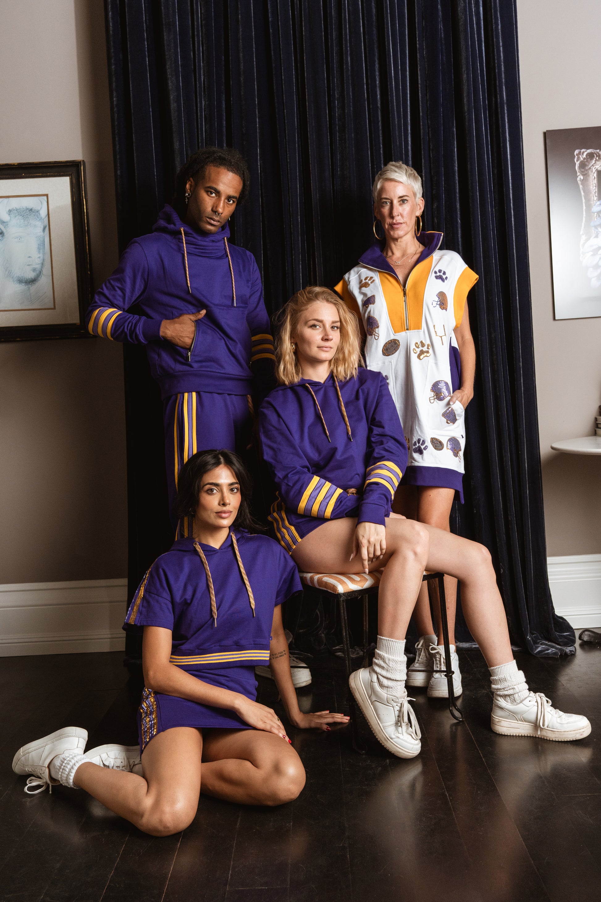 Inspired by retro athletic wear and team colors, this classic tennis skort gets upgraded in deep purple and gold with sequin side stripes. Featuring an adjustable waistband and secret attached shorts.