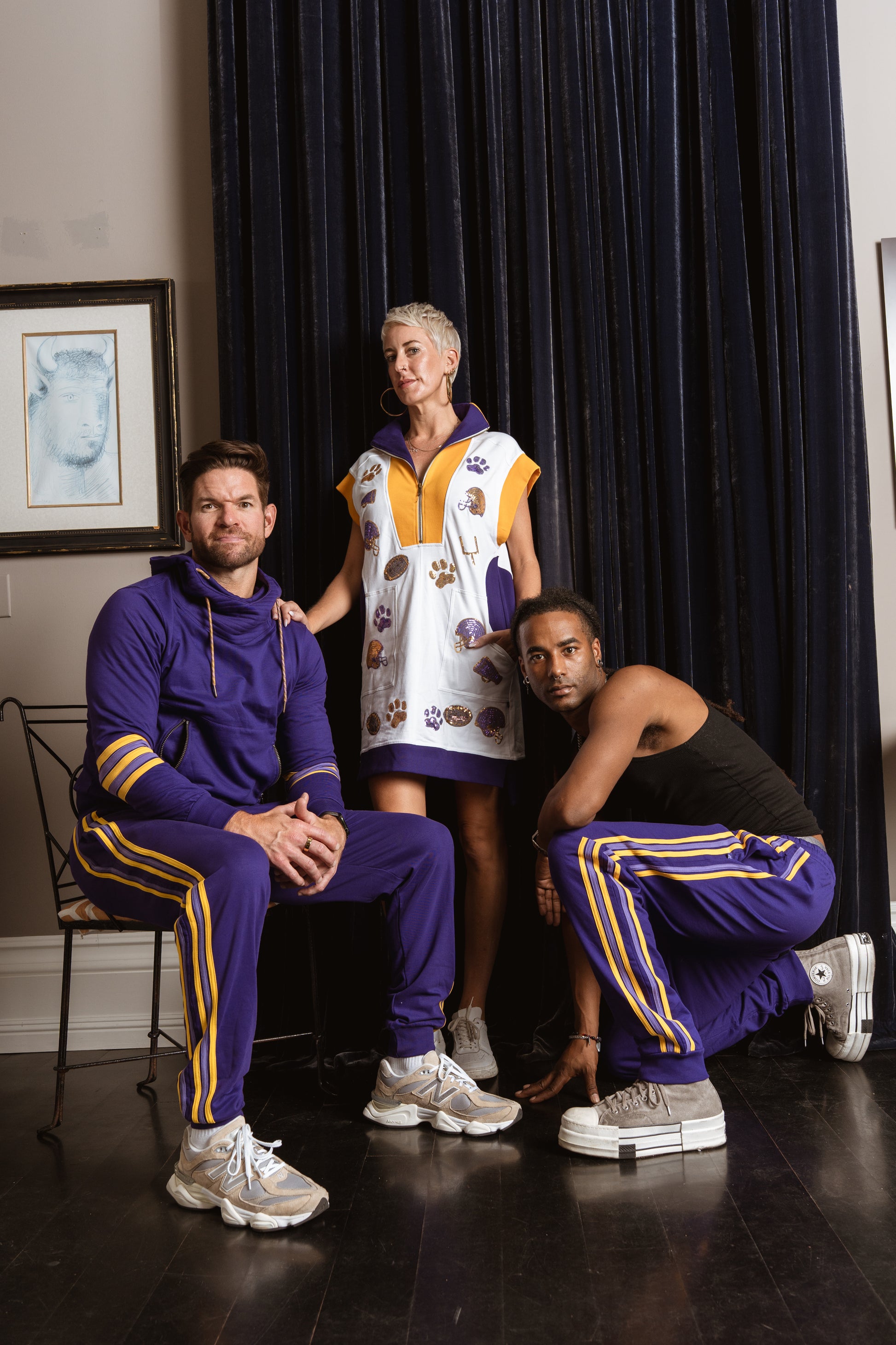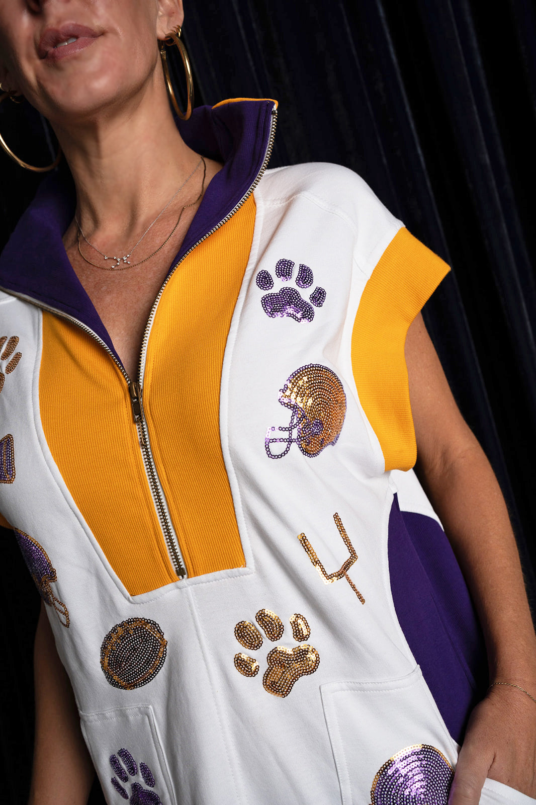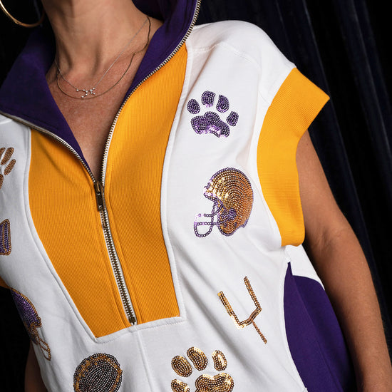 Inspired by retro athletic wear and team colors, this game day essential sports sequin appliqués of tiger paw prints, helmets, and football motifs. Featuring a half-zip neckline, roomy front pockets, a contrast panel design in our deep purple and gold colorway.