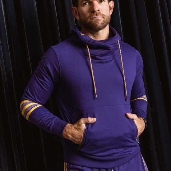 This upgraded sweatshirt nods to retro athletic gear and team colors, sporting deep purple and gold with hand-stitched sleeve stripes. Designed with dual zippered pockets and adjustable drawstrings, this hoodie offers a sleek, ninja-style high neckline silhouette that can be pulled up for extra coverage on breezy days.