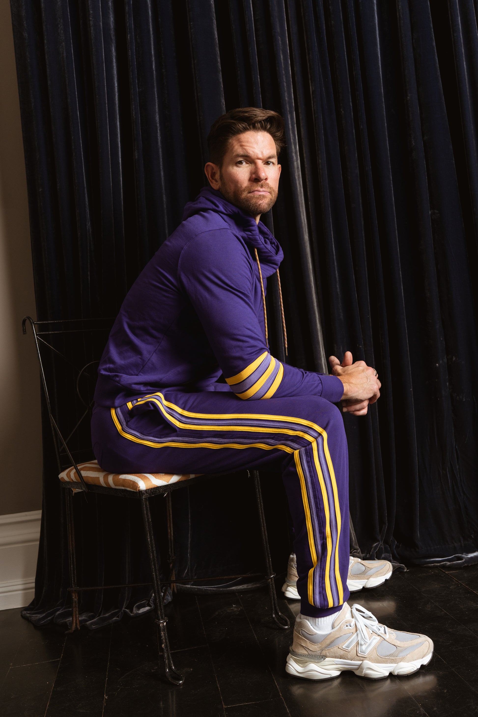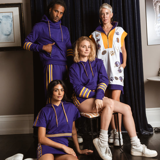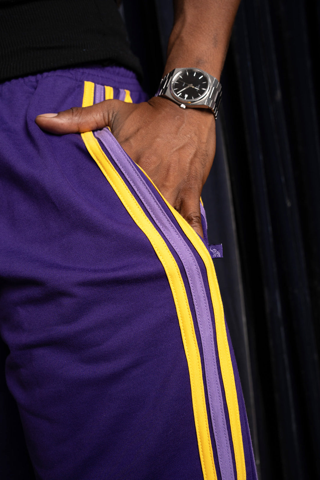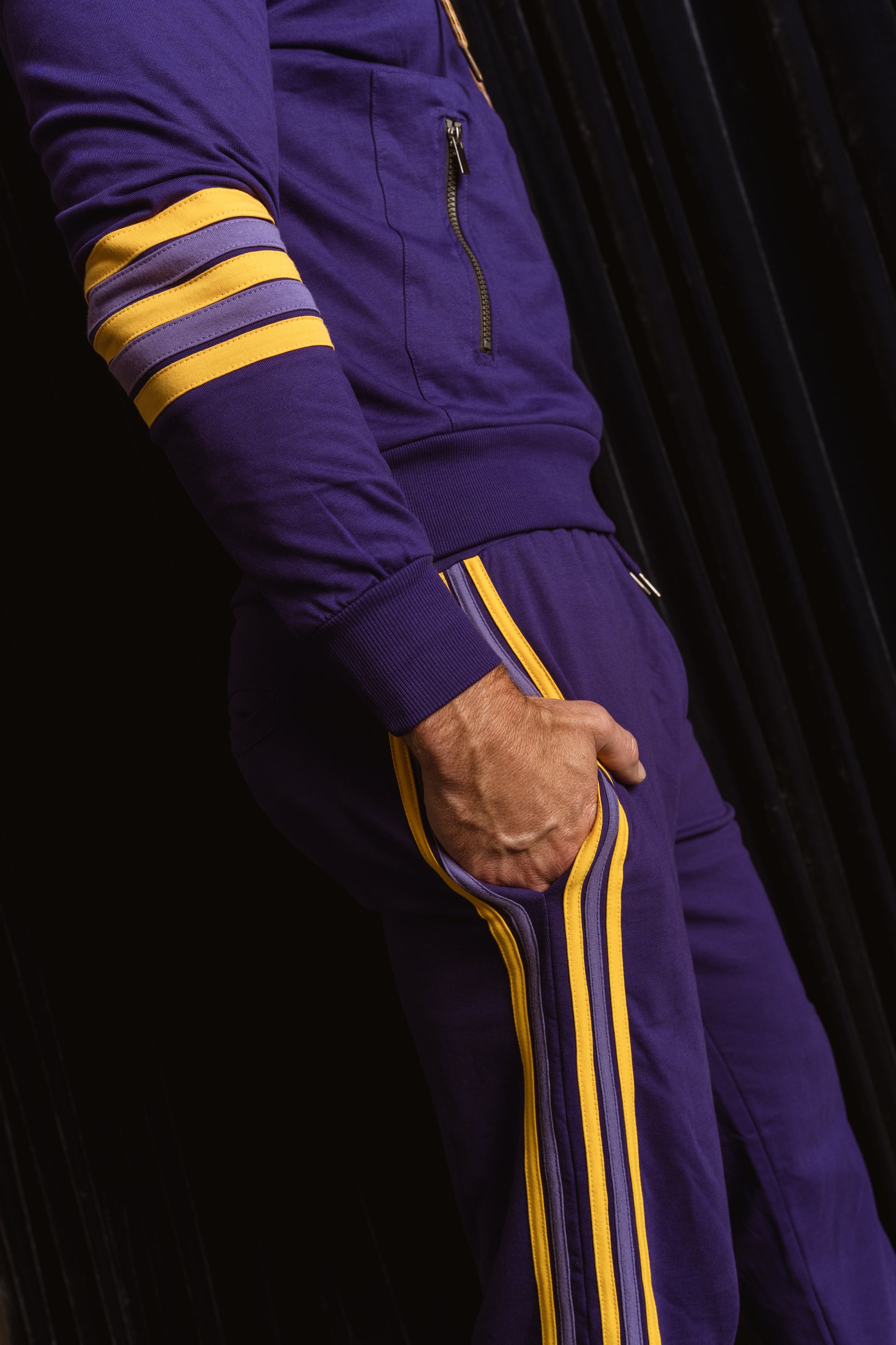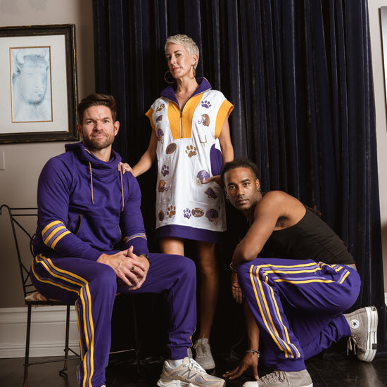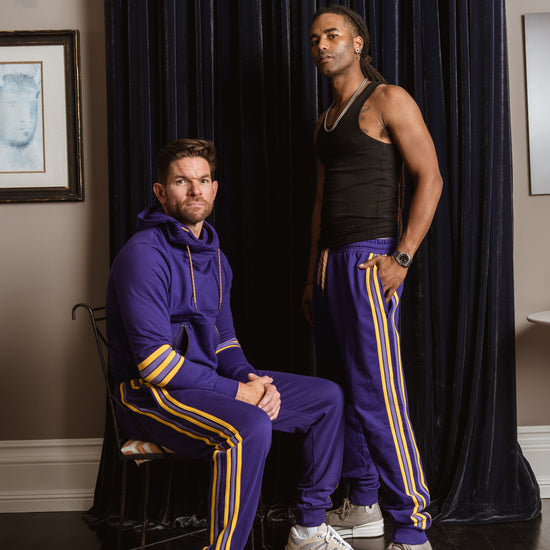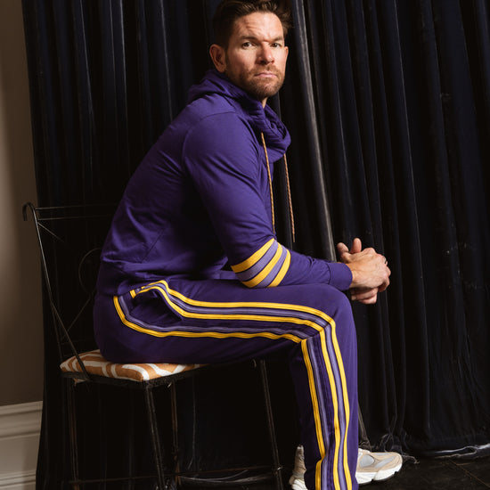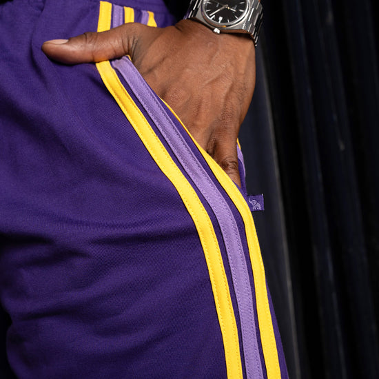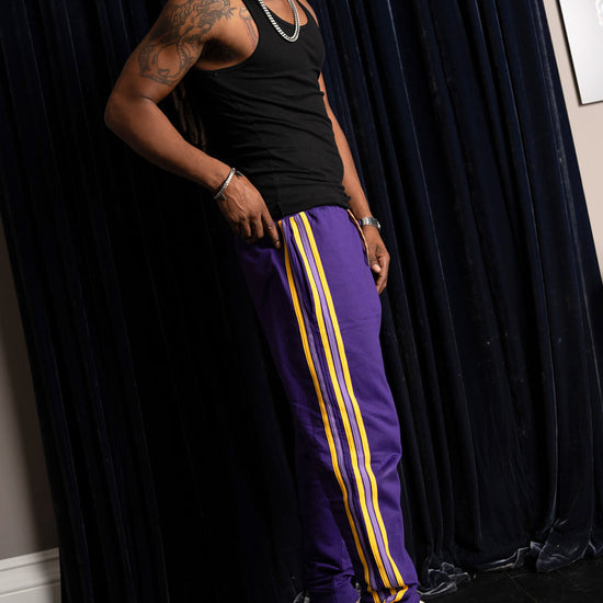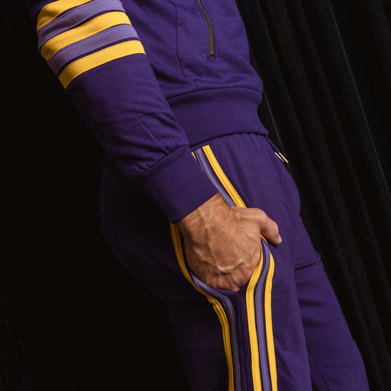 Inspired by retro athletic gear and team colors, these classic joggers sport a deep purple and gold with hand stitched leg stripes down the side. Featuring an elastic waistband, side pockets, tapered cuffs, and a relaxed fit that's made to move with you.
